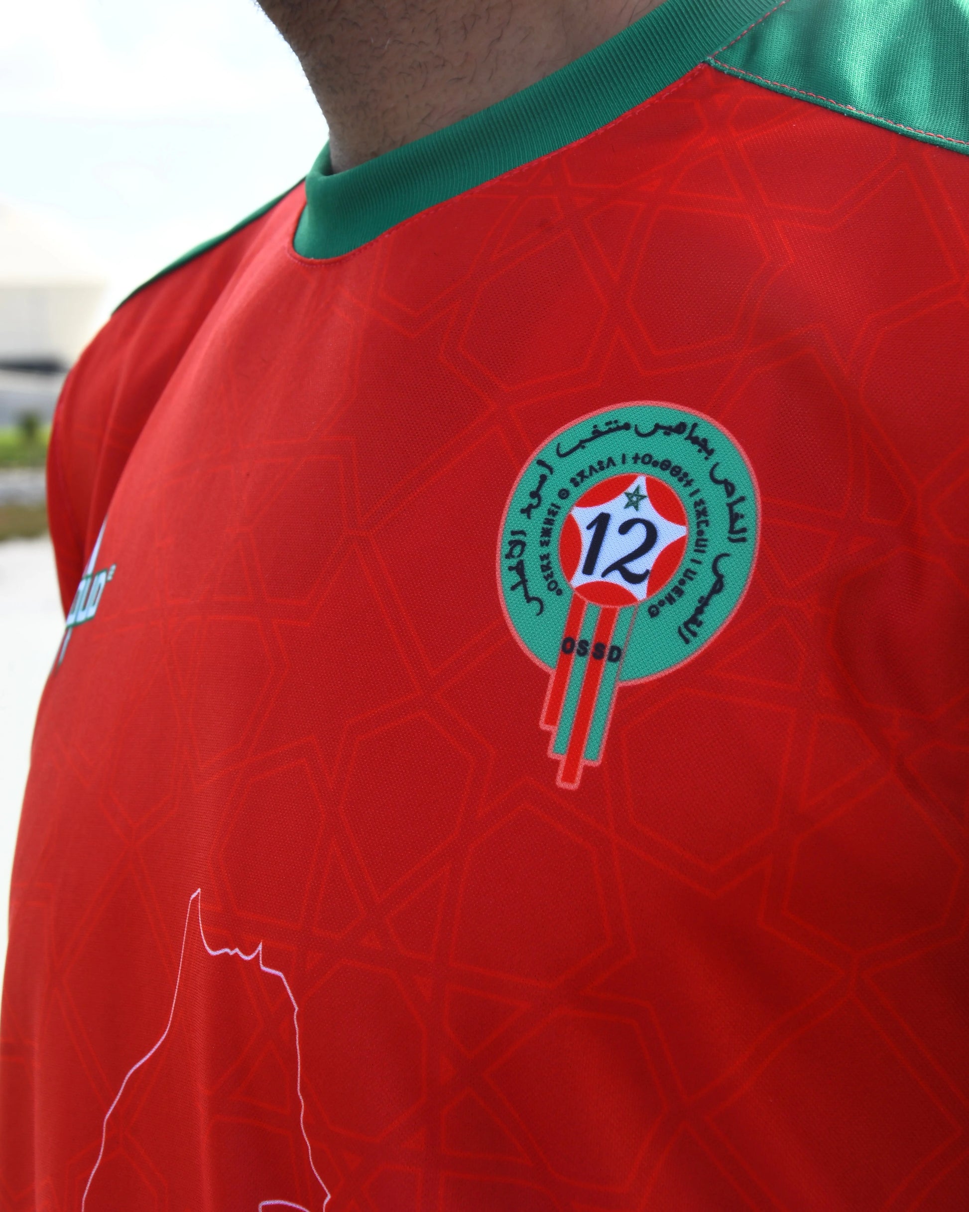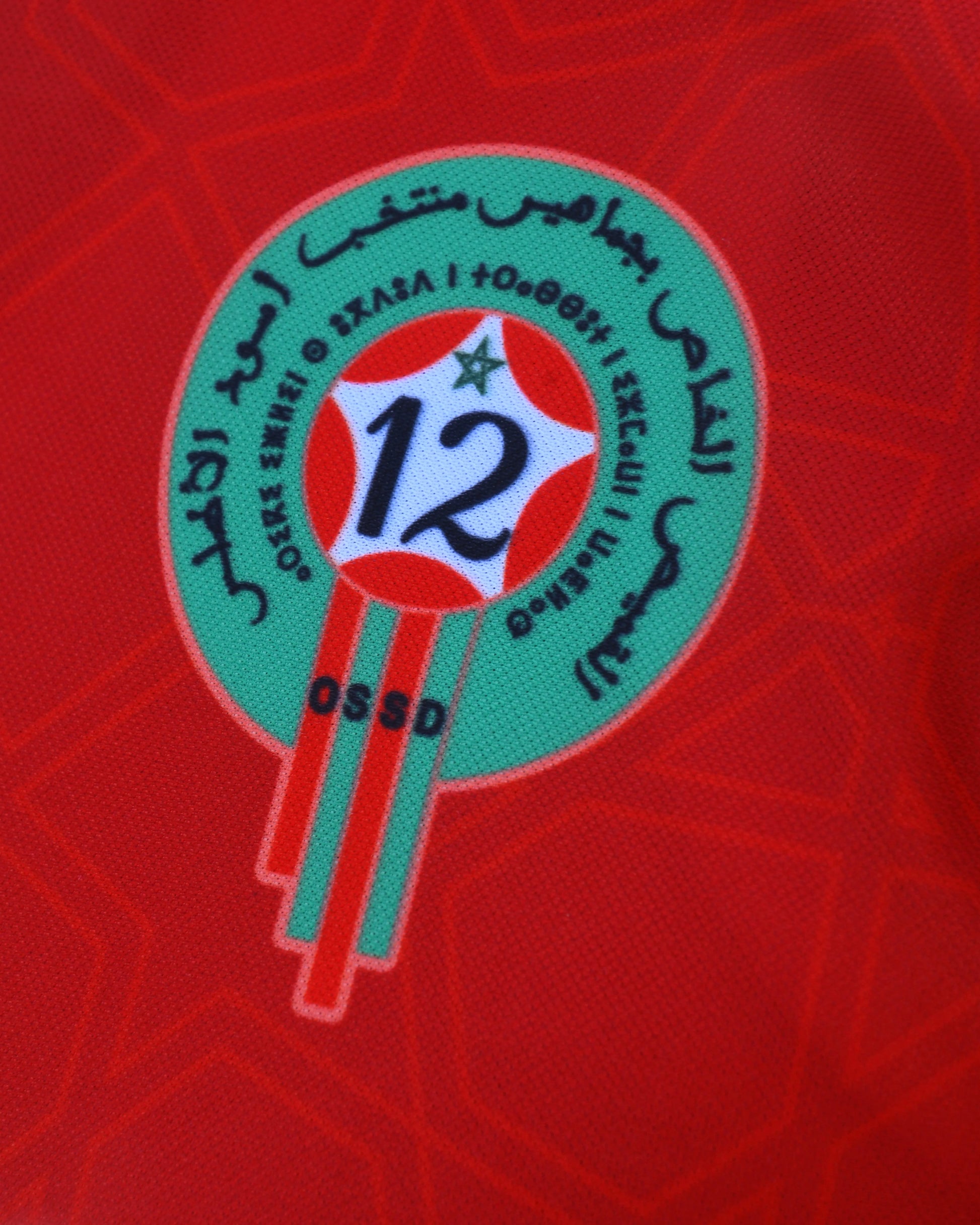 Sur la manche droite, une carte du Maroc renforce l’identité nationale, et sur la manche gauche, l’inscription « أسود الأطلس » célèbre l’esprit du supporter marocain.